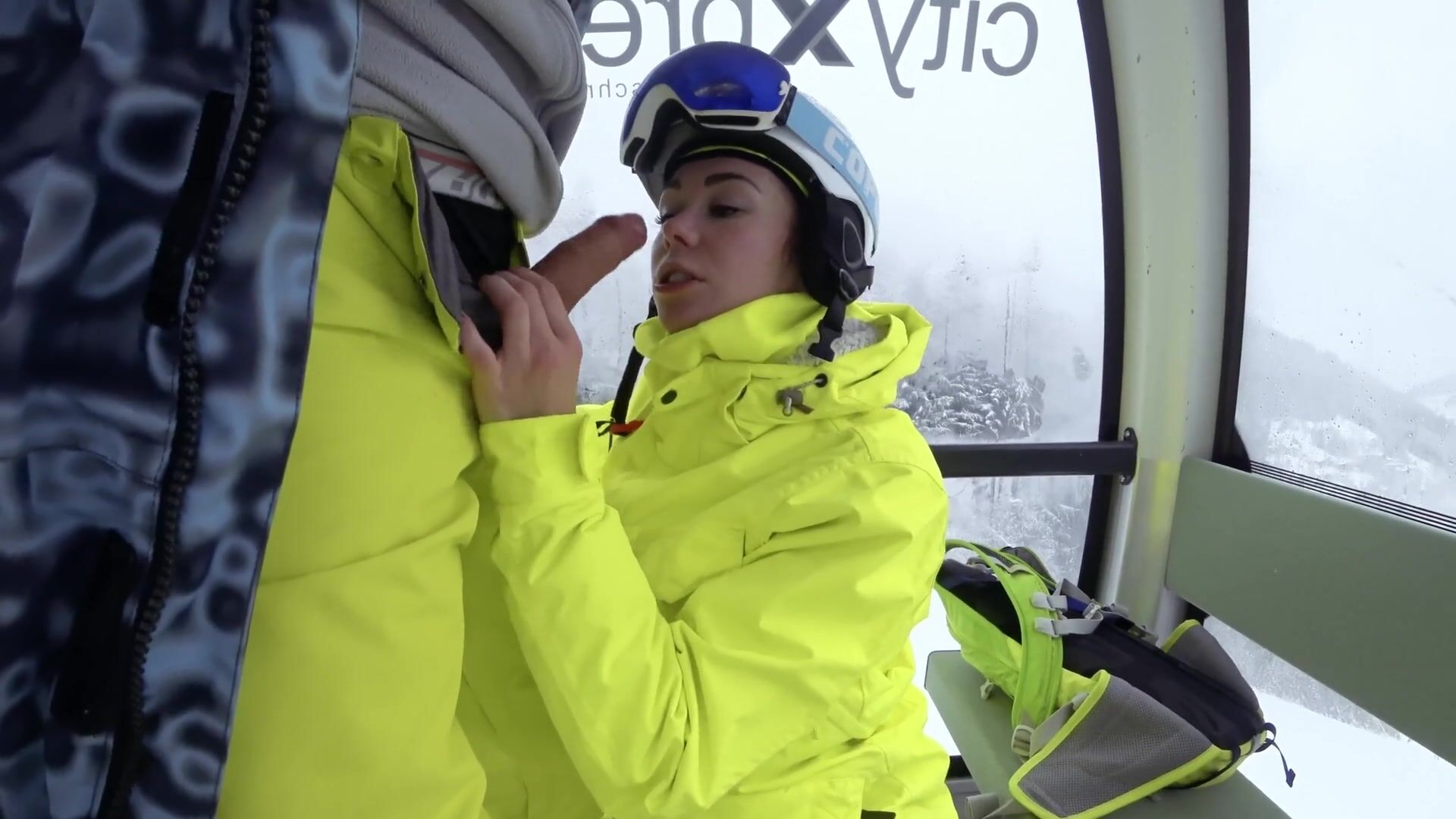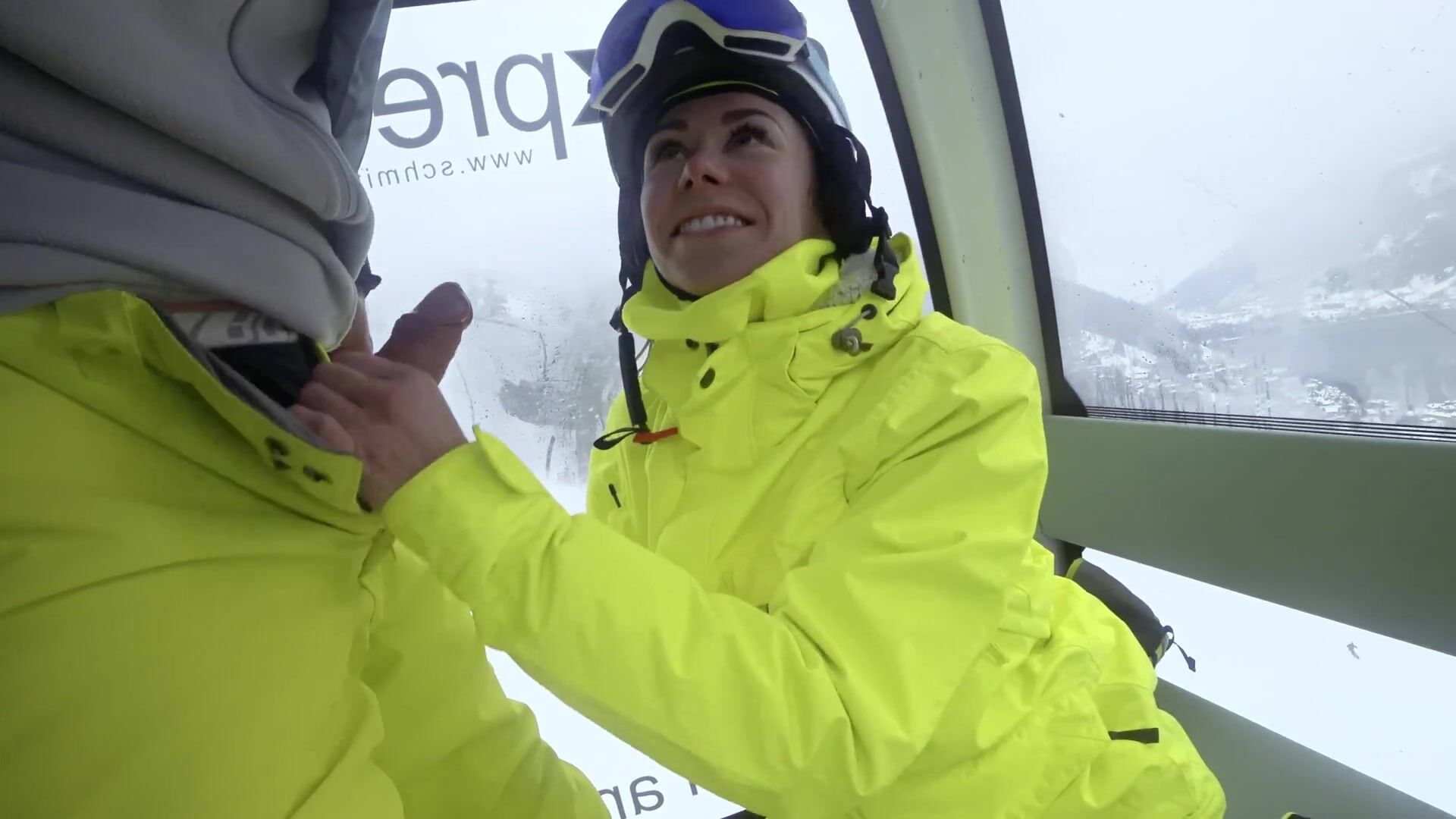 Cumshot in mouth in ski lift