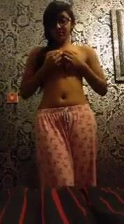 Glasses girl took off her pajamas t-shirt at night, completely naked and caressing her pussy Indian Video