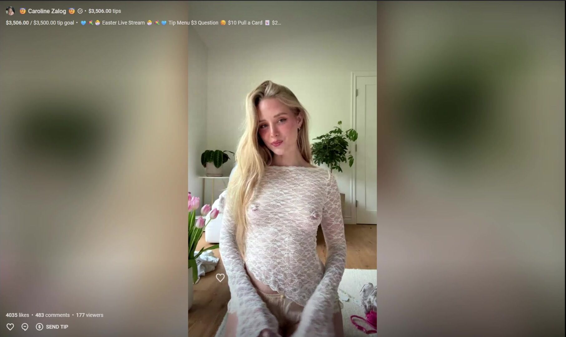 Blonde beauty Caroline Zalog in sheer lingerie during her Easter live stream video, showing off her perfect curves.