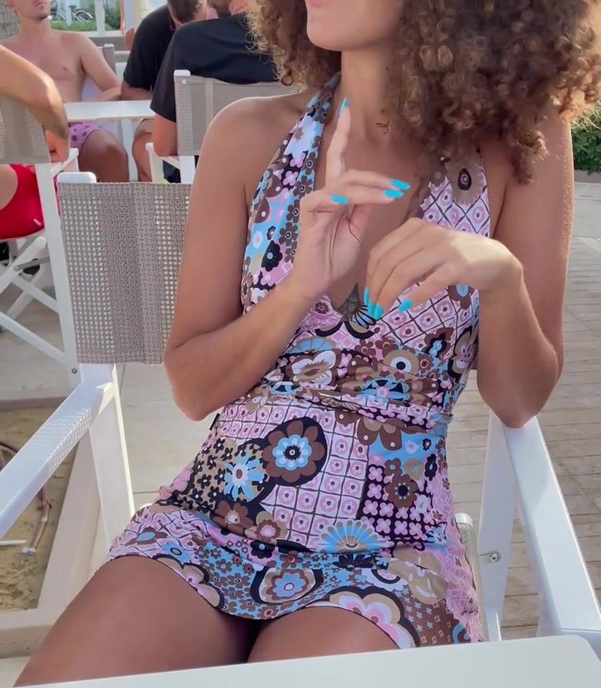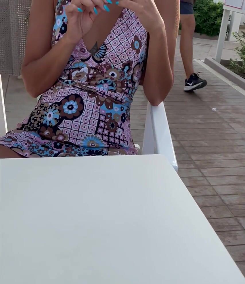 Horny girlfriend without panties shows wet pussy on the terrace